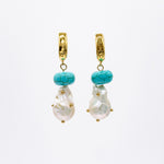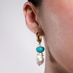 Aretes de plata .925 con chapa de oro de 24k, una perla barroca blanca colgante con destellos de colores, adornada con diminutos destellos metálicos que evocan estrellas en el firmamento y una turquesa en la parte superior. Su diseño tiene un aire galáctico y atemporal, perfecto tanto para hombres como para mujeres que buscan una pieza distinta, moderna y llena de misterio. Elegantes y versátiles, son el complemento ideal para quienes quieren llevar un pedacito del universo consigo.