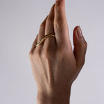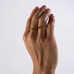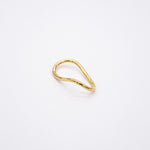 Este anillo es un gesto en metal que captura el flujo: un alambre de bronce chapeado en oro, semigrueso trabajado a mano y doblado con delicadeza para crear una línea ondulada que recorre y abraza dos dedos, generando sensación de movimiento y armonía. Ajustable mediante ligera flexión, su forma es a la vez escultórica y cómoda, ofreciendo un acento elegante que trasciende estilos y géneros.